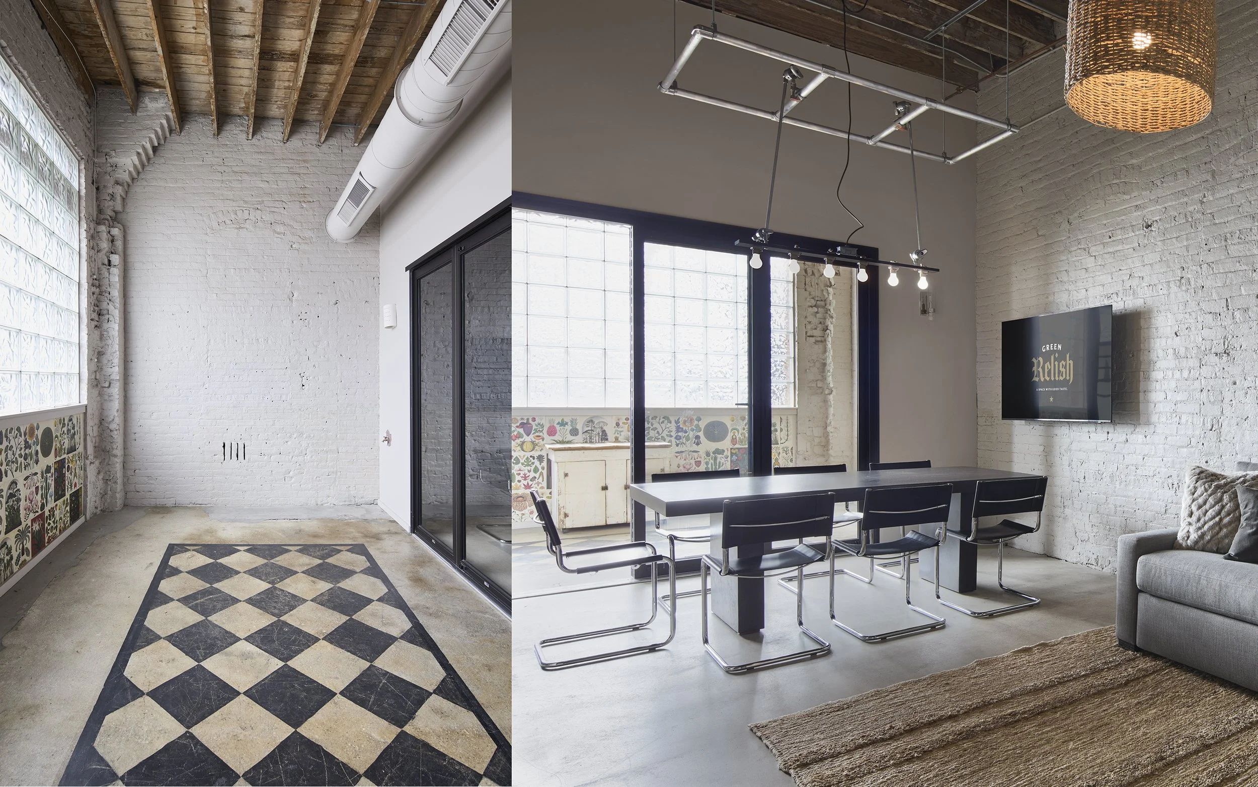 Large 12’ × 8’ glass block window on the south wall provides consistent natural light. Overhead task lighting at conference table.